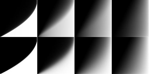 | Slices of the 3D LUT with increasing \(Roughness\) left to right and increasing \({N\cdot V}\) top to bottom. The 2D LUT is just the second slice that corresponds to \({N\cdot V=1}\). |