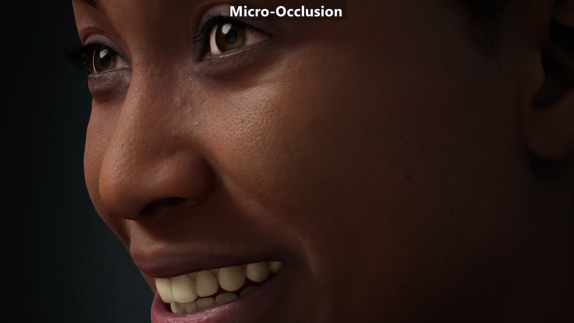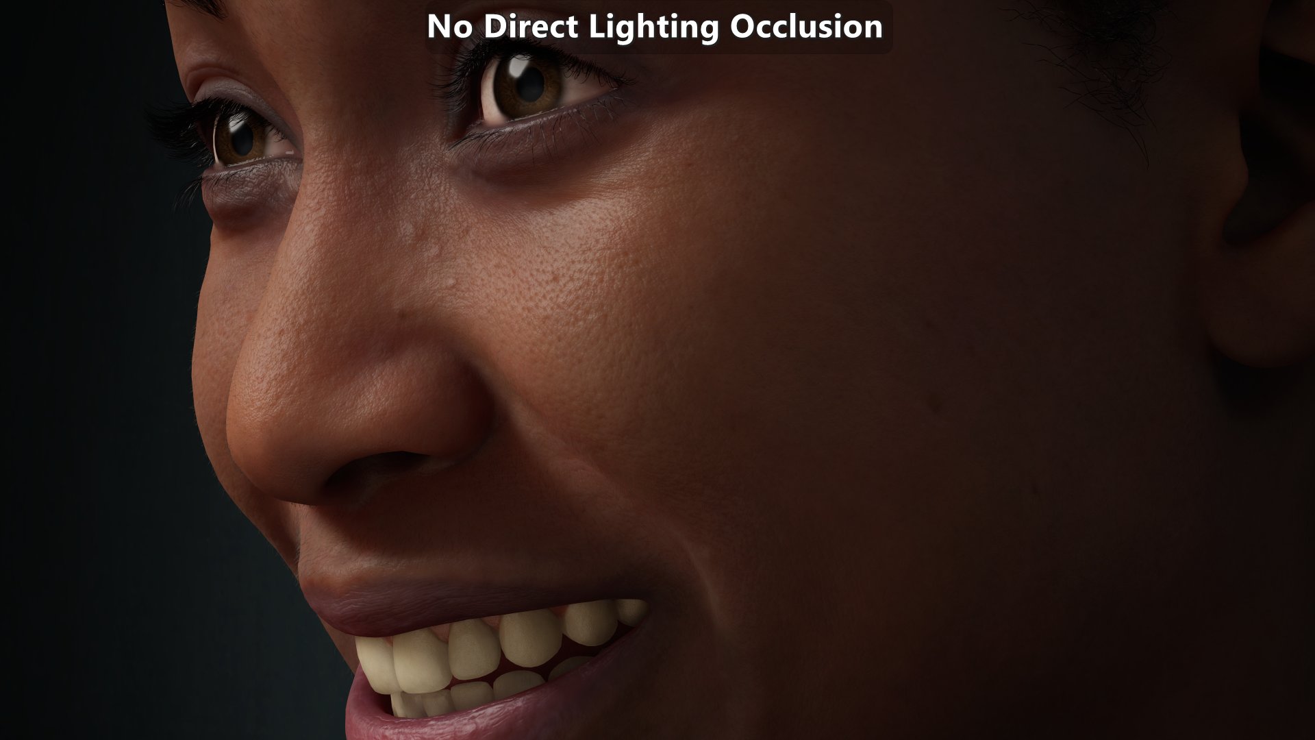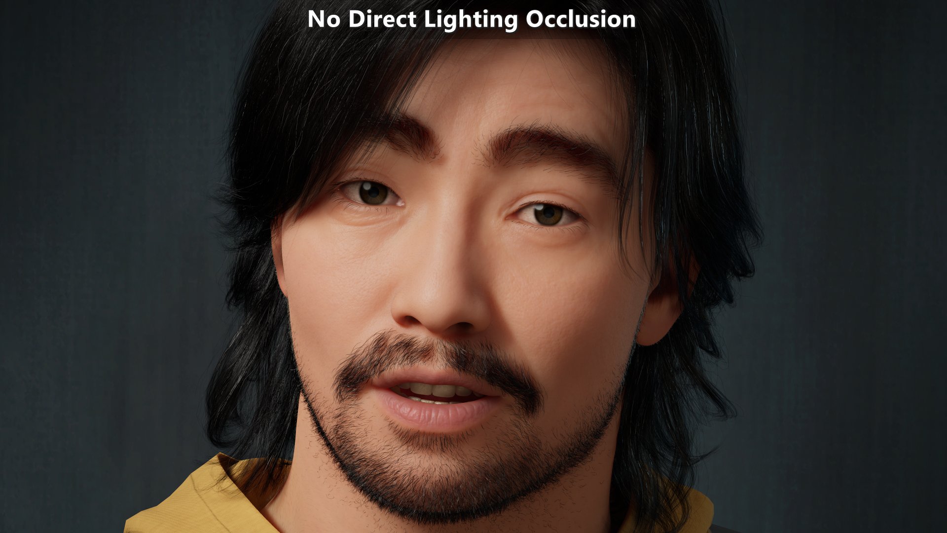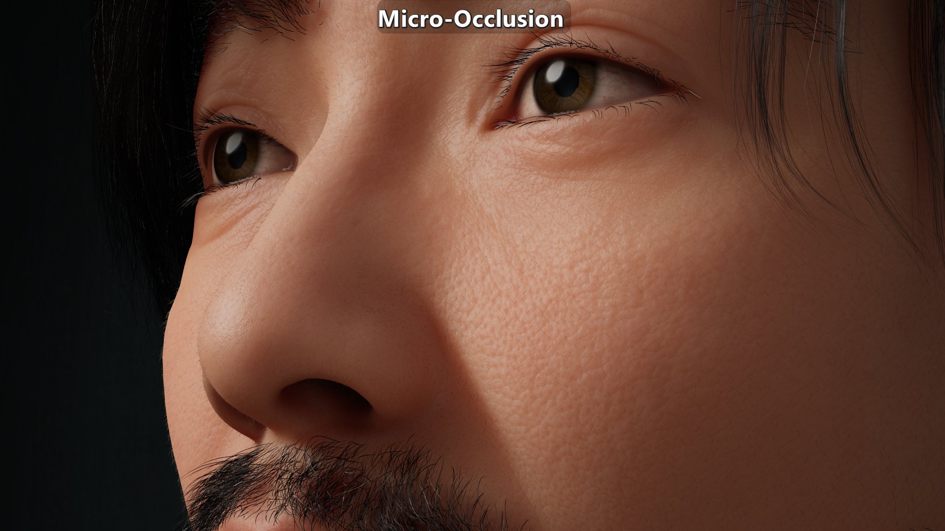 Modified version of a MetaHuman sample. Animated albedo disabled, shaders and subsurface profiles modified to make them move physically based. Micro-occlusion data is the same on close ups and further away. The key light is on the right from the character’s point of view which explains why the left side of the character from their point of view shows more micro-shadowing