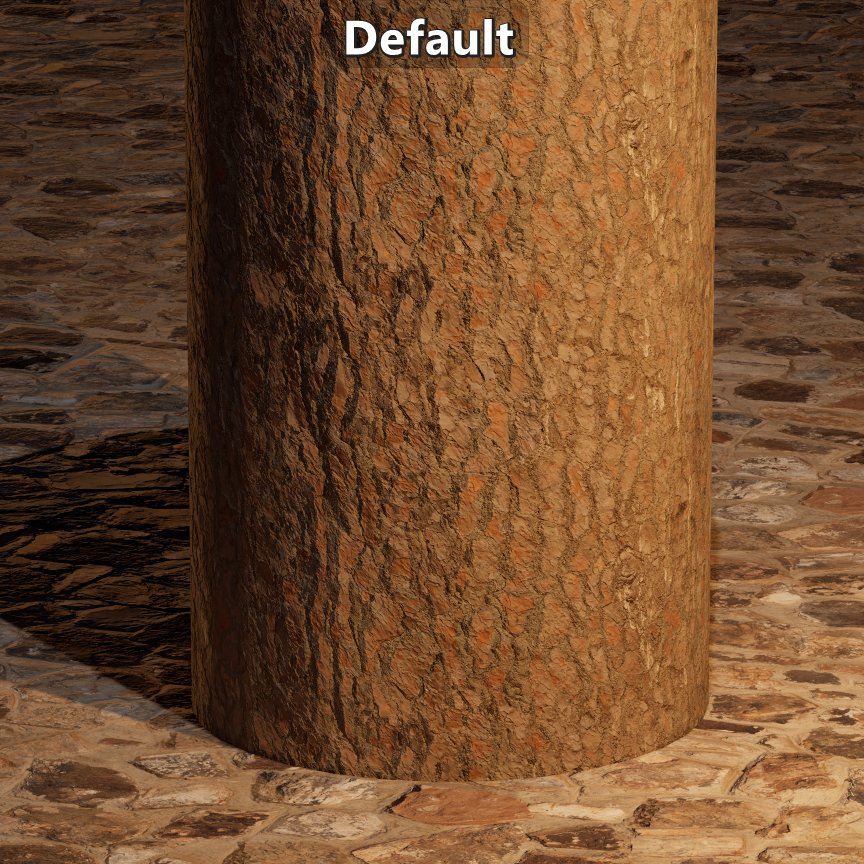 At \({Roughness=0.0}\) the function follows the reference function, both ends of the \({Visibility}\) range returns what’s expected, and there is a change of the micro-shadowing based on \({\left\langle \omega_{g}\cdot \omega_{i} \right\rangle}\) aka \({N\cdot V}\). What’s also visible comparing the two rows of plots is that, if necessary and at a quality cost, the micro-shadowing can be simplified assuming that \({\left\langle \omega_{g}\cdot \omega_{i} \right\rangle = 1}\). But enough with the math and plots, lets look at the results on the comparison scene.
