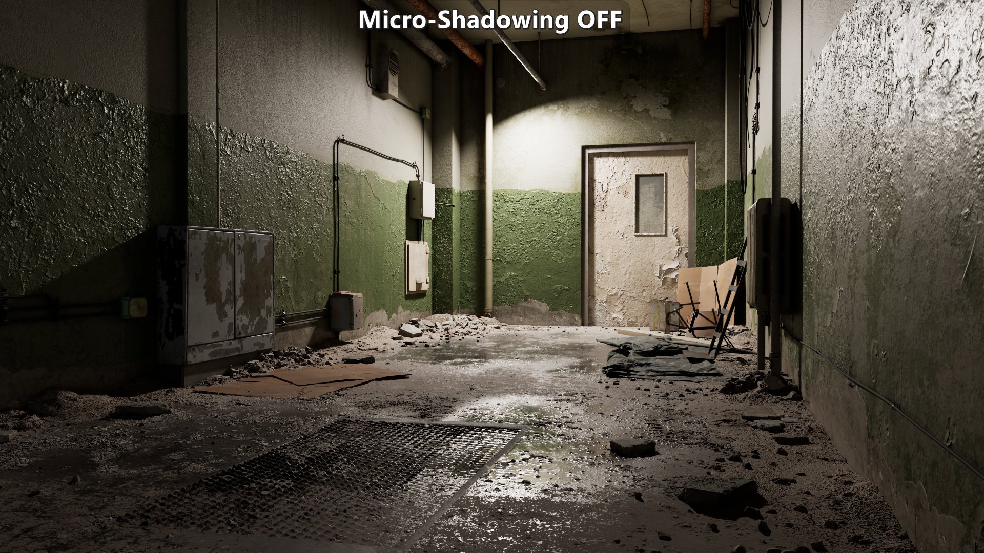 | Damaged plaster texture set on a flat plane with high roughness on the left half, and low roughness on the right half. Notice how the sharpness of the micro-shadowing changes with roughness. |