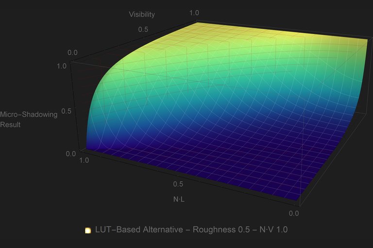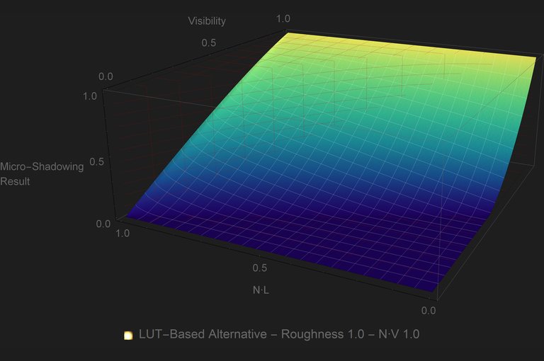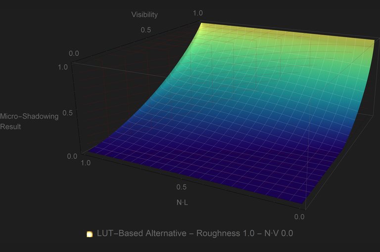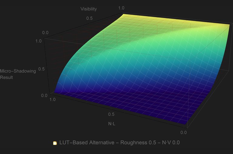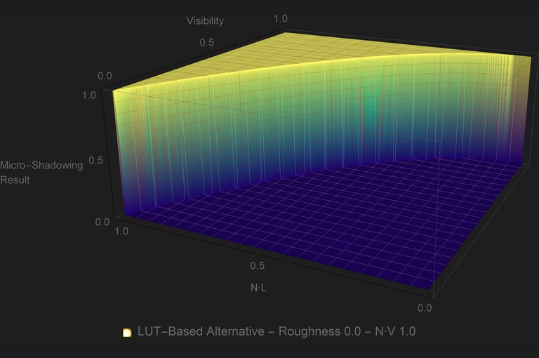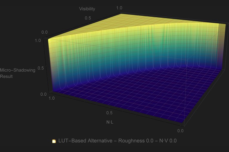 The use of LUTs for this kind of approximations is quite common. Most PBR engines have at least the DFG LUT. But unlike the DFG LUT, the micro-shadowing LUT will have to be sampled per light, so it is important to avoid that where possible. Looking at the plots it is evident that for GGX there is a substantial area of the plot where the micro-shadowing result is \({0.0}\) no matter what the inputs are. That means that for that area of inputs we can skip the look up onto the LUT. If \({2{Visibility}+{\left\langle \omega_{g}\cdot \omega_{o} \right\rangle}\lt 1}\) then the micro-shadowing result is \({0.0}\).