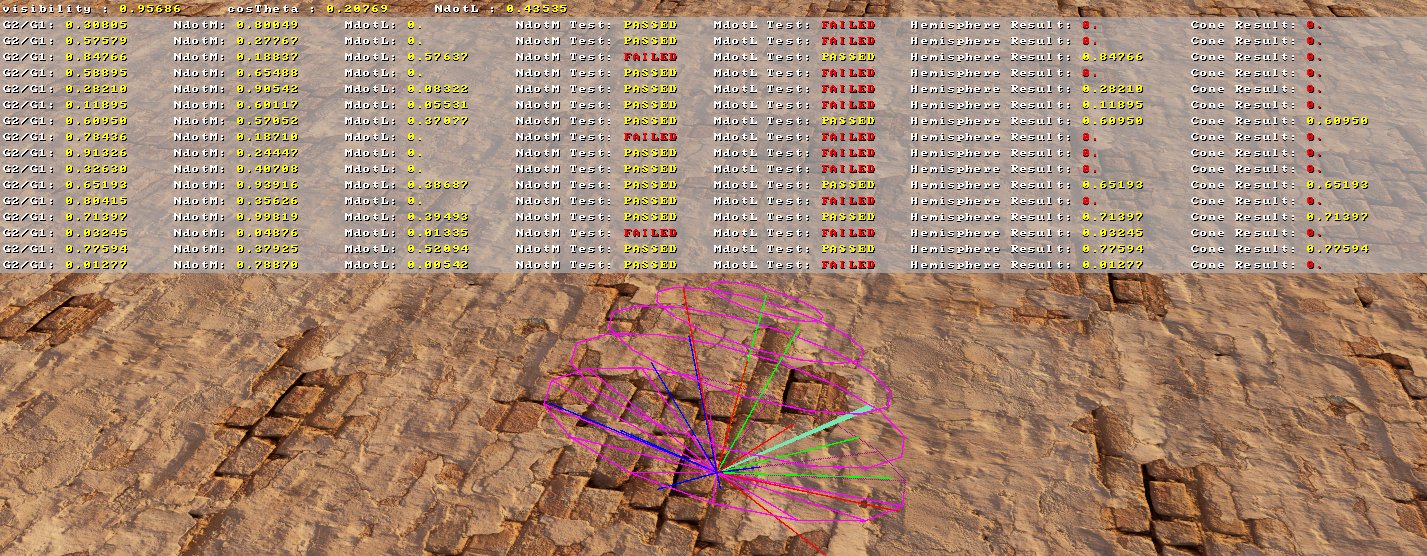 | Debug view of the micro-shadowing by a directional light of a single pixel implemented on Unreal Engine 5. 16 VNDF samples, sun direction in emerald, visibility cone in magenta. Microfacets micro-shadowed by the hemisphere in blue, and by the visibility cone in red. |