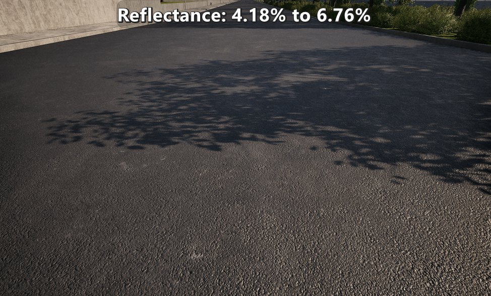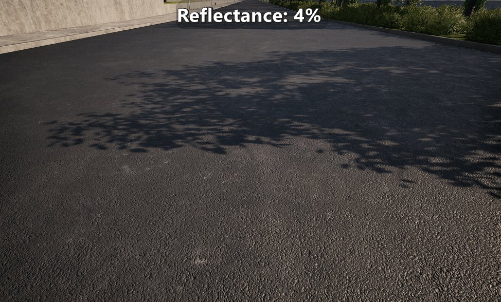 - Hard to source data ready to use. Except for some databases which have at least an index of refraction (IOR) value available, a fair level of technical expertise is necessary to source and interpret other data available. For example, if an artist needs to make a asphalt road, sourcing a reflectance value involves looking at a relevant paper (for example “Characterization of stripping properties of stone material in asphalt” by Lyne et al), looking at the index of refraction of the different minerals and the bitumen, come up with a range of values, and convert those to a reflectance or specular value that the engine can use.