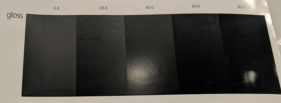 Physical sample in a regular meeting room lighting condition showing the same Munsell N1 color swatch in decreasing roughness. Note how the color seems to get darker as smoothness increases. |