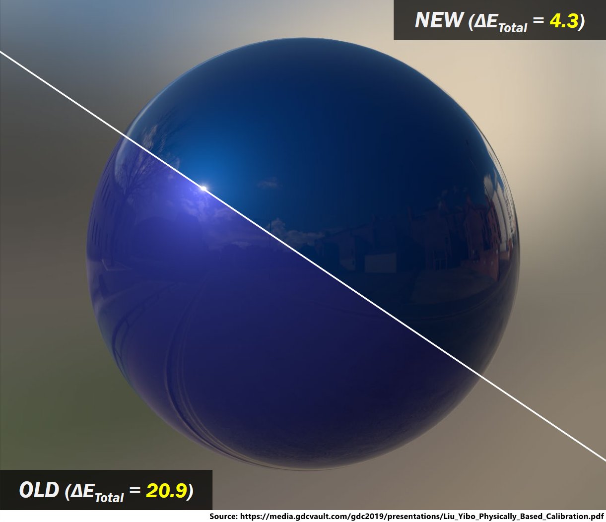 For conductors the work is a bit different. Many common metals have values you can use from common databases. For more specialized cases like metallic car paints the use of a multi-angle spectrophotometer is recommended if you need accurate representation of them. Note that when you don’t have measurements, then odds are that materials quality will suffer because it is specially challenging to hit proper specular color values out of photos.