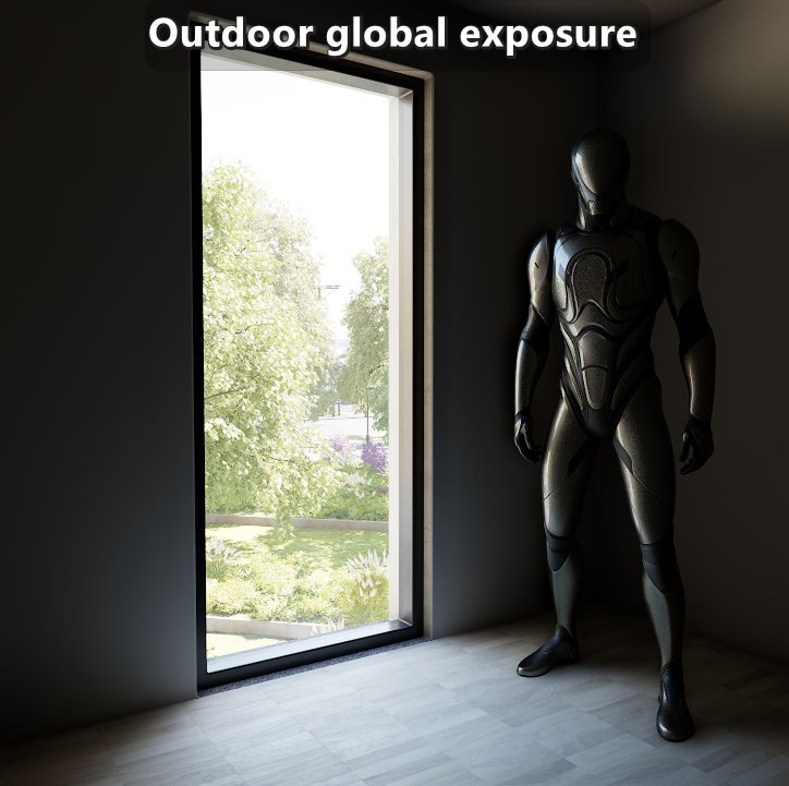 The outdoor lighting is way more intense than indoor. Local exposure is used to get the desired results instead of changing the intensity of the sun and sky. |