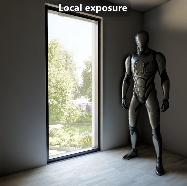 One example of that relates to exposure. If you take a picture in real life from a dark indoor towards a window in a bright sunny day, then you will be able to expose for the indoor or the outdoor. It isn’t possible to have both exposed correctly at the same time since the difference in luminance is just too big. While having the outdoors overexposed might be realistic, there needs to be some art direction to ensure readability of the outdoor for gameplay reasons. A seemingly easy fix is to reduce the intensity of the sun and sky such that the dynamic range is compressed. While that might fix that specific gameplay issue, it does that at the expense of time of day and cinematics quality. Using post effects solutions like local exposure can give you the result you want when you need them.