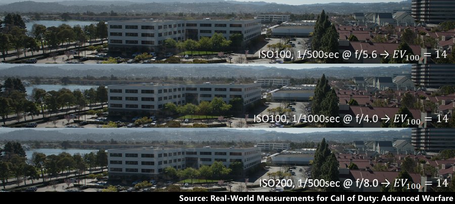 When the implementation is correct different combinations of those parameters can result in the same exposure as seen below. This means that convention around exposure values such as EV100 can be leveraged. And this also means that basic rules, such as the sunny 16 rule, can be followed in engine.