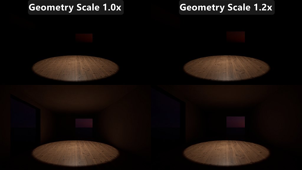 There is one personal experience that comes to mind related to the geometry scale impact on lighting. Years ago, I was working on an indoor sport game and I was the main rendering engineer focused on lighting and materials. The roof of one of the stadiums never looked quite right and it was more expensive in terms of performance than many of the stadiums that seemed more complex. When I took a look I found some lights that were added to boost up the indirect bounce on the roof and upper stands. When I disabled those lights, performance increased but those areas looked too dim even though the lighting values at the playing surface were matching real life illuminance measurements. Eventually the stadium had to be updated due to authenticity requirements and the stadium was laser scanned. And that’s when we found out that the old geometry was incorrect, and the roof was quite a few meters away from the playing surface compared to the stadium in real life. That caused the indirect bounces to dim down before arriving on the roof which then also affected subsequent bounces.