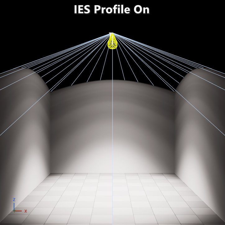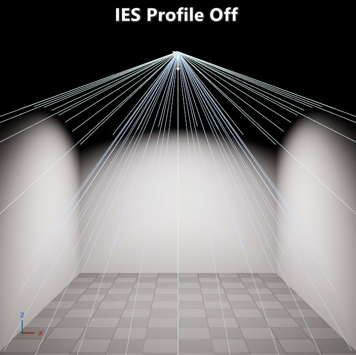 The most common and reliable source of real-world lighting data are the IES profiles. IES stands for Illuminating Engineering Society, and their IES LM-75-19 specification defines a standard method to measure and describe a light’s intensity distribution. This means that the shape and intensity of an actual real-life light is described. Most manufacturers provide IES profiles for their lights which means that the same light can used in engine. Most engines provide the option to take the intensity from the IES profile directly (with an optional scale for artistic control), or to use the regular intensity parameter of the light. It is recommended to use the intensity as provided by the IES profile without any scaling. That will ensure consistent results on engines with a correct implementation of IES profiles. Besides the benefits of having more correct intensities, IES profiles also allow for more interesting results that are hard or impossible to match with regular lights. Unfortunately, they do come at a cost since a texture needs to be sampled for every light with an IES profile assigned.