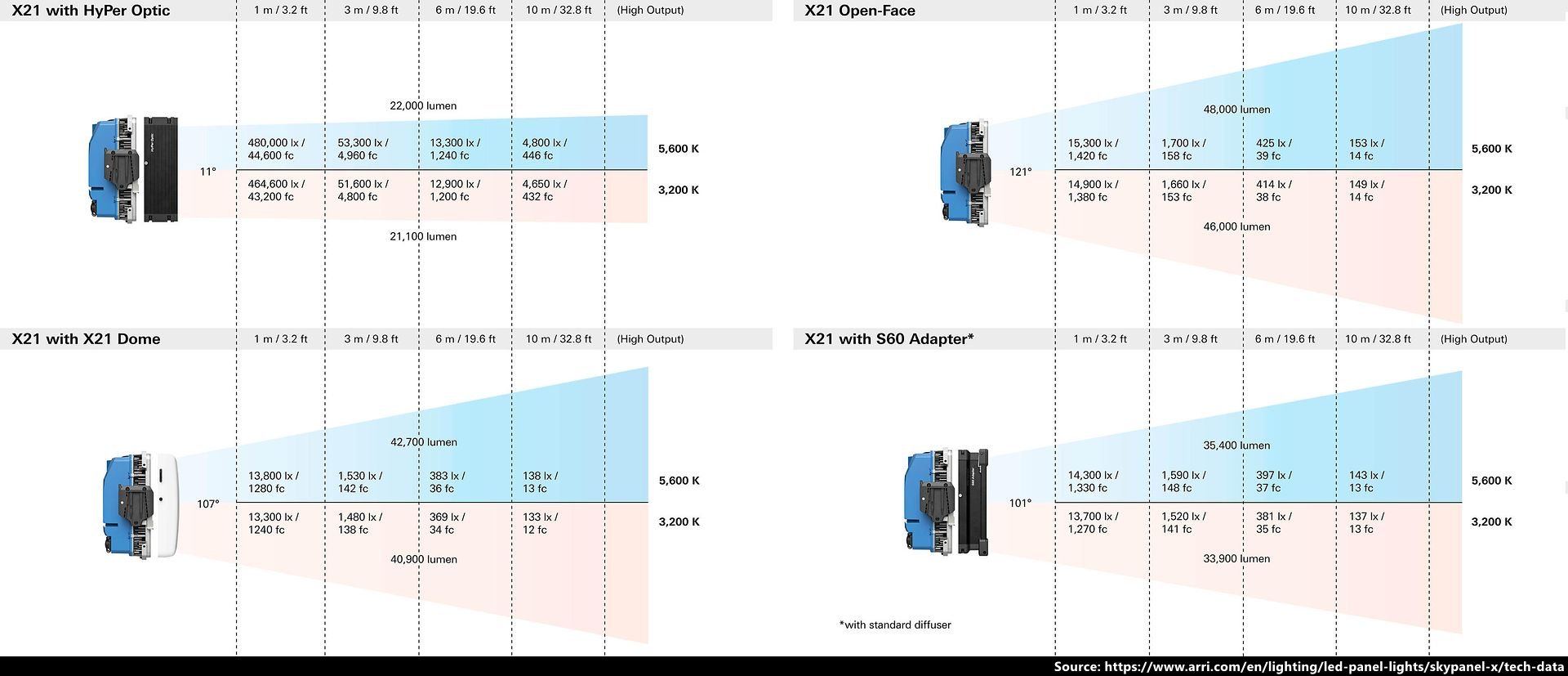 Specifications for an ARRI SkyPanel X with different accessories attached. |