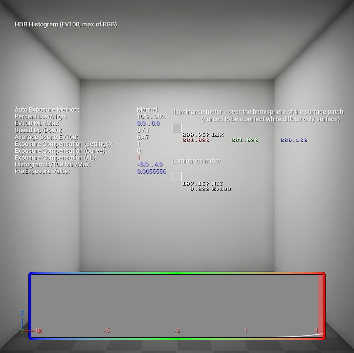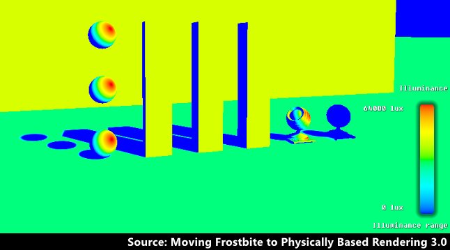 Illuminance and luminance meter in Unreal Engine, and illuminance debug view in Frostbite. |
