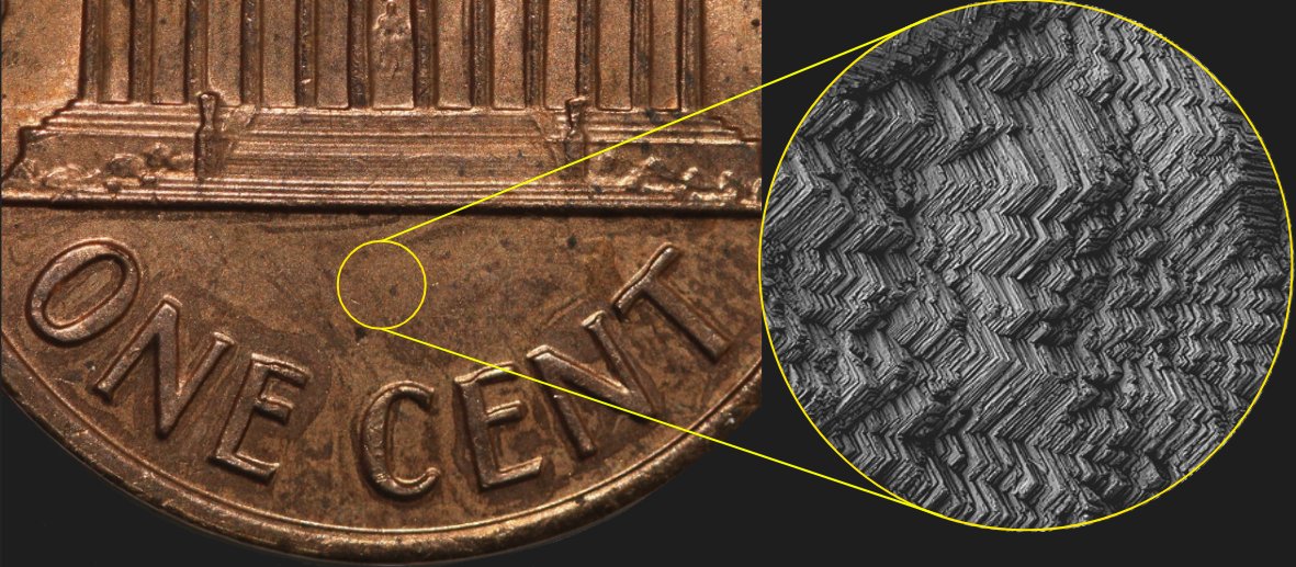 Coin at the geometry and normal map scale on the left, and at 2500x magnification showing what would be represented by a roughness map. |