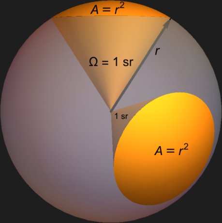 Solid angle (omega) of one steradian with a radius of one. There are 4π steradians in a sphere. |