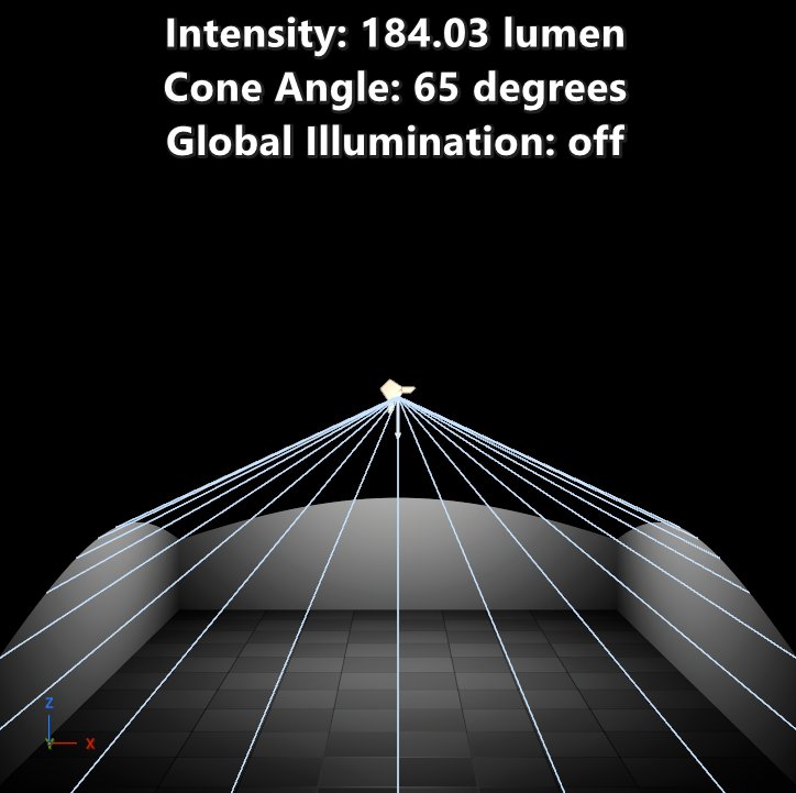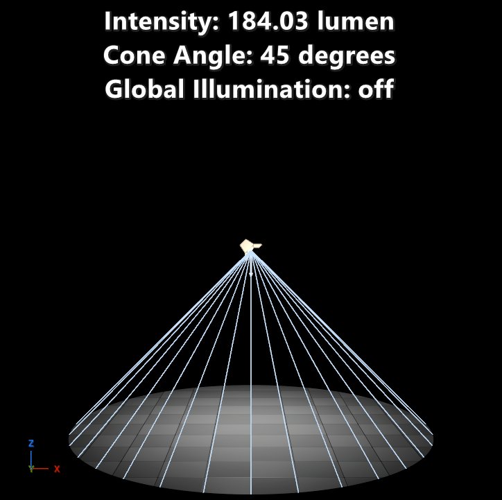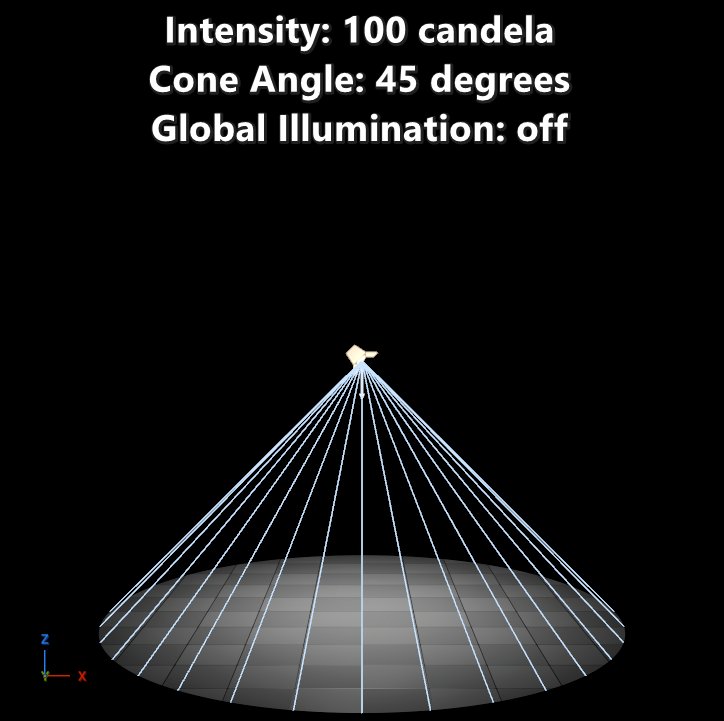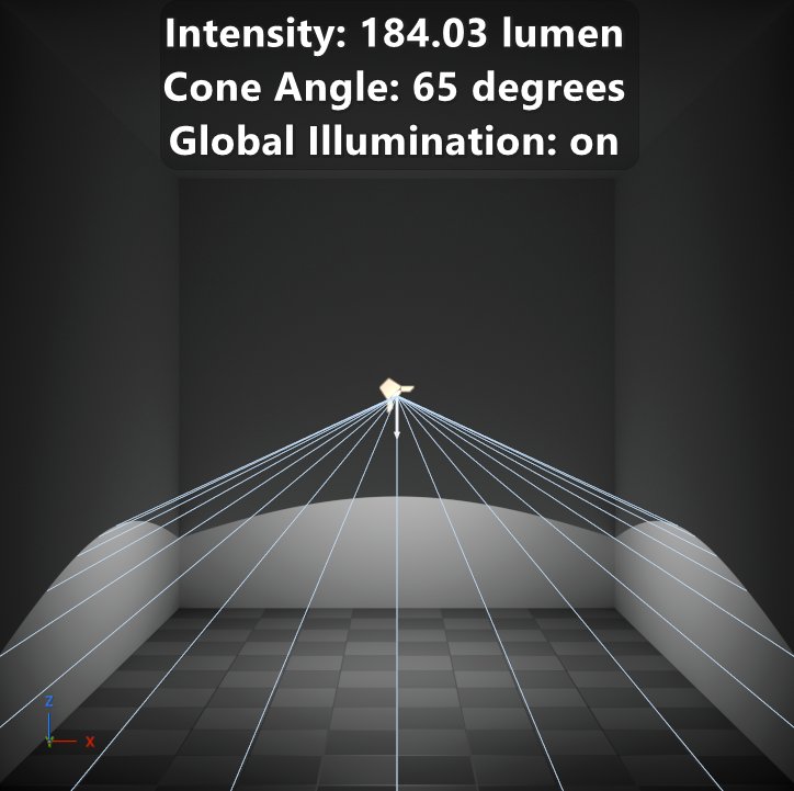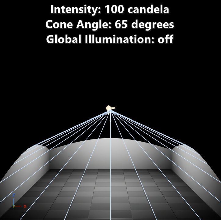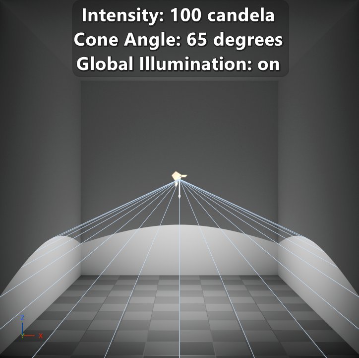 Point lights are simple to understand when it comes to representing the intensity in candela or lumens, and that’s because the solid angle is fixed to be 4π steradians. But the change comes with spotlights as the cone angle of emission is controlled by the artist. Because the candela represents the intensity per unit solid angle, then no matter what’s the cone angle of the spotlight the intensity will remain the same. But with lumens that’s different. Since a lumen represents intensity in all directions, as the cone angle of the spotlight gets smaller the perceived intensity of the light increases since all the power going in all directions is getting focused onto that cone angle as seen in the screenshots below. This means that the conversion from lumen to candela and vice versa requires the solid angle for the conversion. You will usually (if not always) find light bulbs mention the number of lumens in the packaging since that’s a consistent value independent of the lighting fixture.
